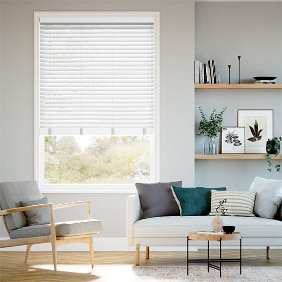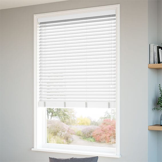 Enjoy a window dressing that will never go out of style, the Atlanta Bright White Faux Wood Blind.